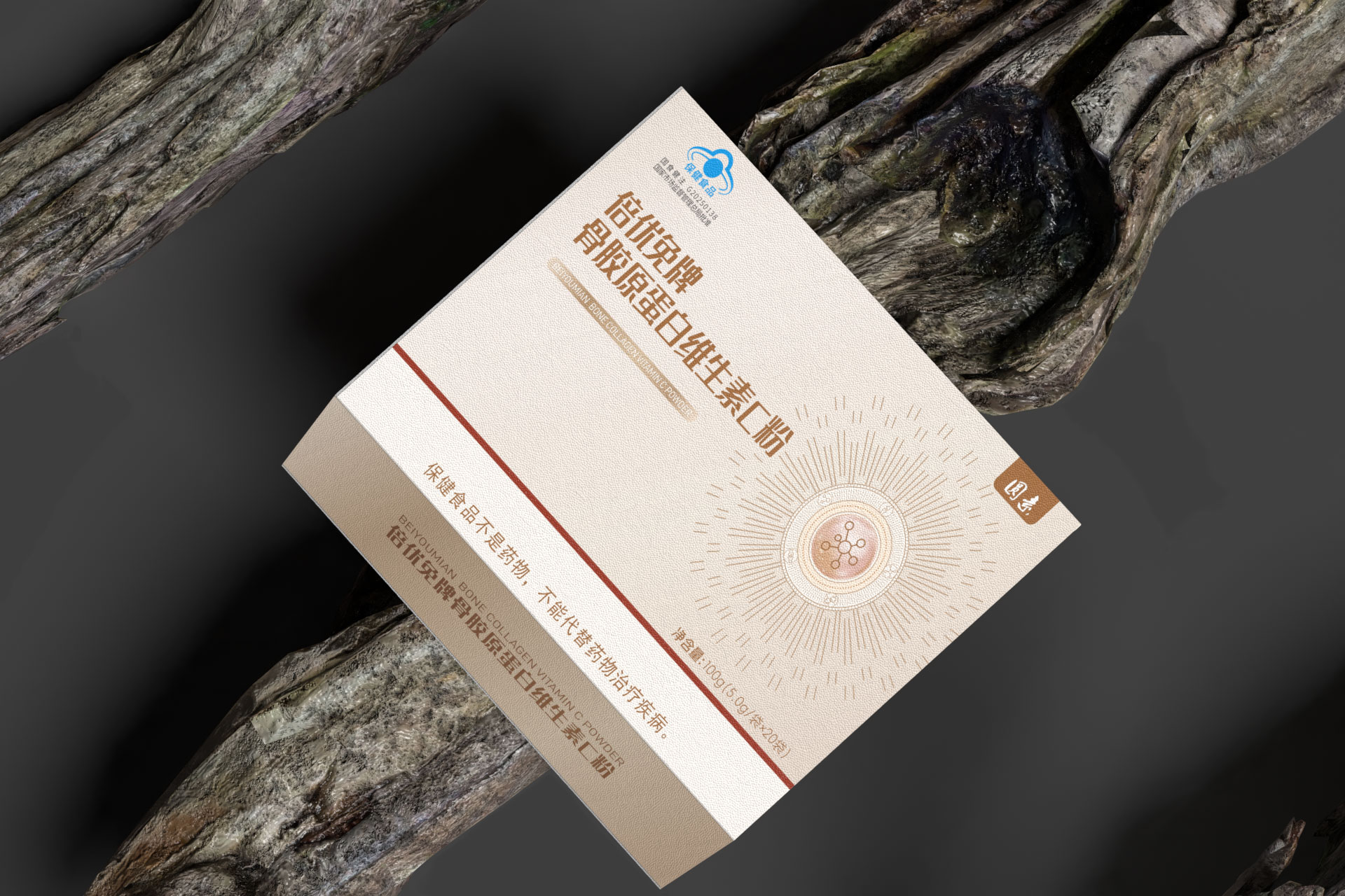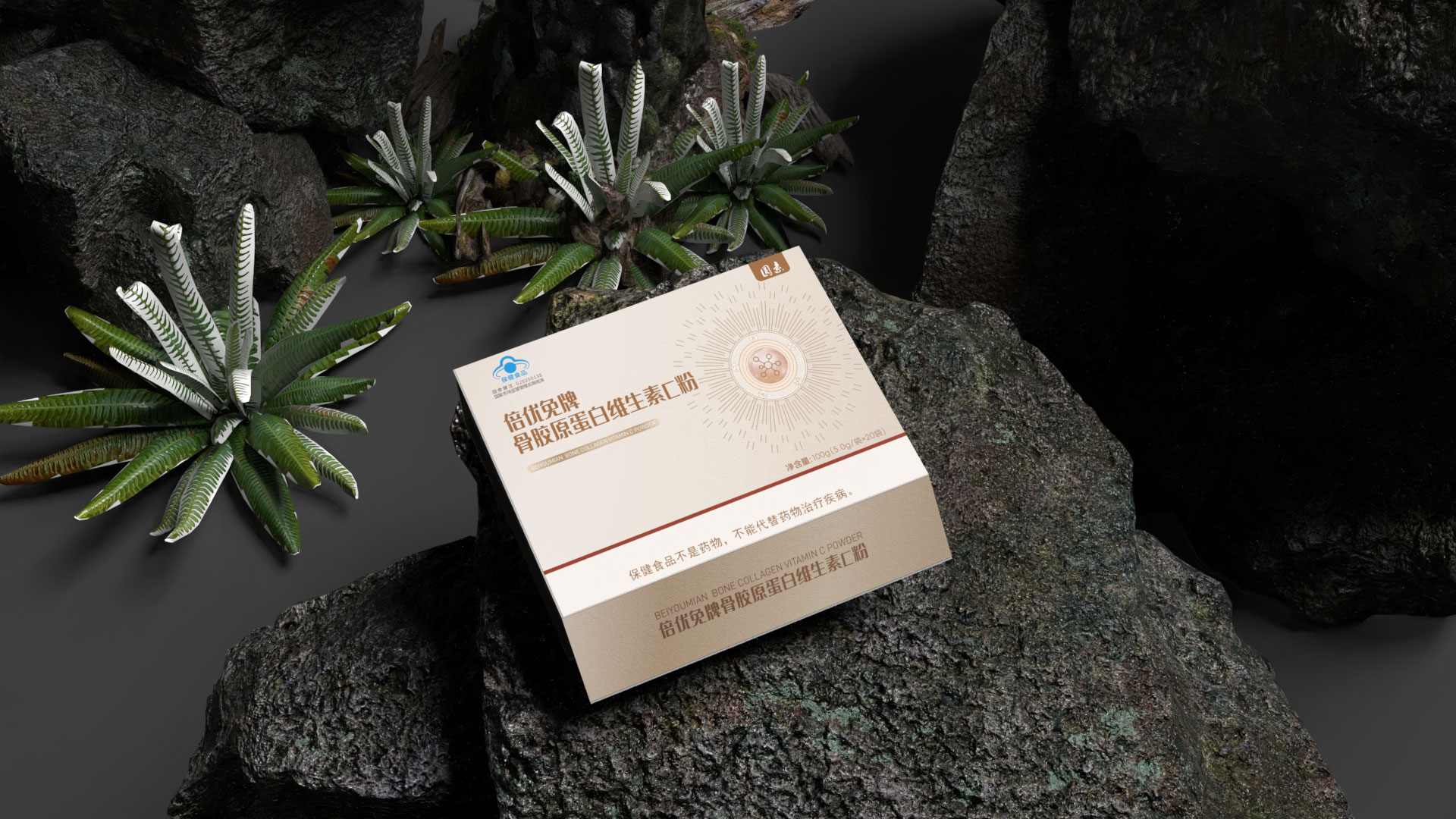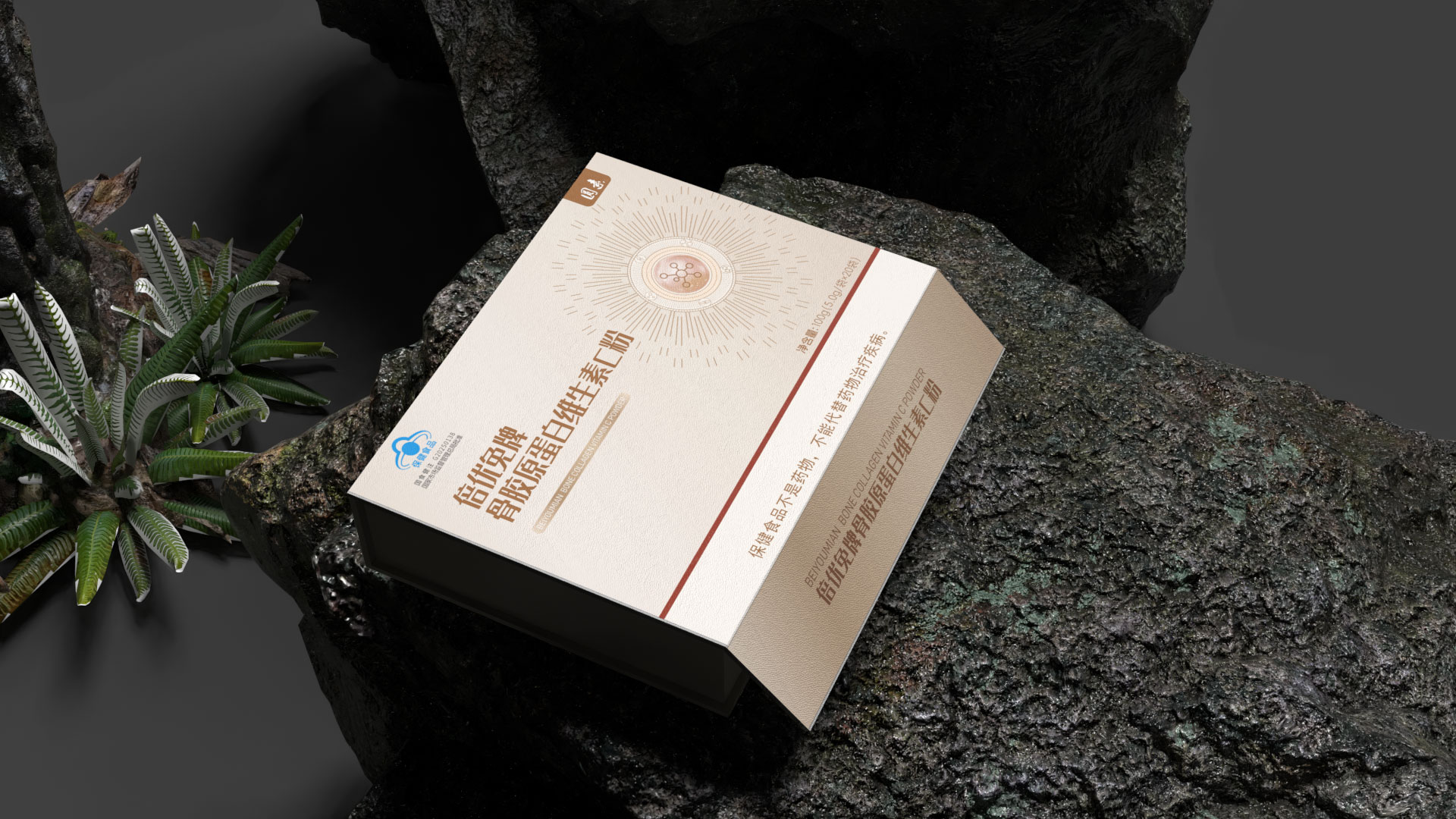 圖形符號(hào): 設(shè)計(jì)了一個(gè)抽象的 “分子融合” 圖標(biāo),巧妙地將膠原蛋白螺旋結(jié)構(gòu)與維生素C分子形態(tài)相結(jié)合,直觀傳達(dá)“科學(xué)配比,協(xié)同增效”的產(chǎn)品核心。